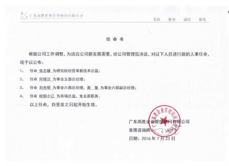 高勝咨詢,在“以奮斗者為本”的理念基礎(chǔ)上,強(qiáng)調(diào)貢獻(xiàn)大小而不是能力大小,在忠誠的前提下,直接以“客戶感動”與“目標(biāo)達(dá)成”為評價標(biāo)準(zhǔn),選拔“德藝雙馨”的咨詢師為公司管理層。