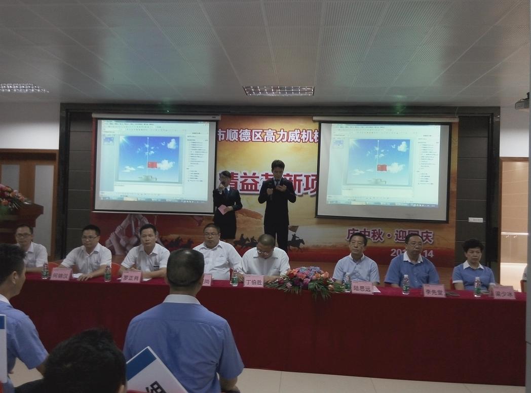 2016年9月14日下午3點(diǎn),在一陣歡快的運(yùn)動員進(jìn)行曲中,佛山市順德區(qū)高力威機(jī)械有限公司精益革新項(xiàng)目誓師,暨慶中秋迎國慶員工大會正式拉開序幕。高力威總裁陸思遠(yuǎn)先生、項(xiàng)目總監(jiān)李先堂先生、高勝咨詢首席咨詢師丁佰勝老師、高勝研究院院長廖宜尚老師、高力威項(xiàng)目經(jīng)理何錦漢老師、高級咨詢師曾鑫老師及高力威中高管理層及各產(chǎn)線員工出席了此次盛會。