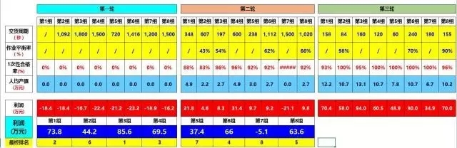 第三輪,沙盤規(guī)則允許學(xué)員們請顧問老師來改善經(jīng)營狀況,顧問老師引導(dǎo)小批量連續(xù)流的方式及導(dǎo)入工裝夾具、平衡改善、多能工培養(yǎng)等改善,并協(xié)助成員們調(diào)整。最后的結(jié)果是驚喜的,每組都出現(xiàn)了盈利,而且完成訂單量有了大幅度增加。