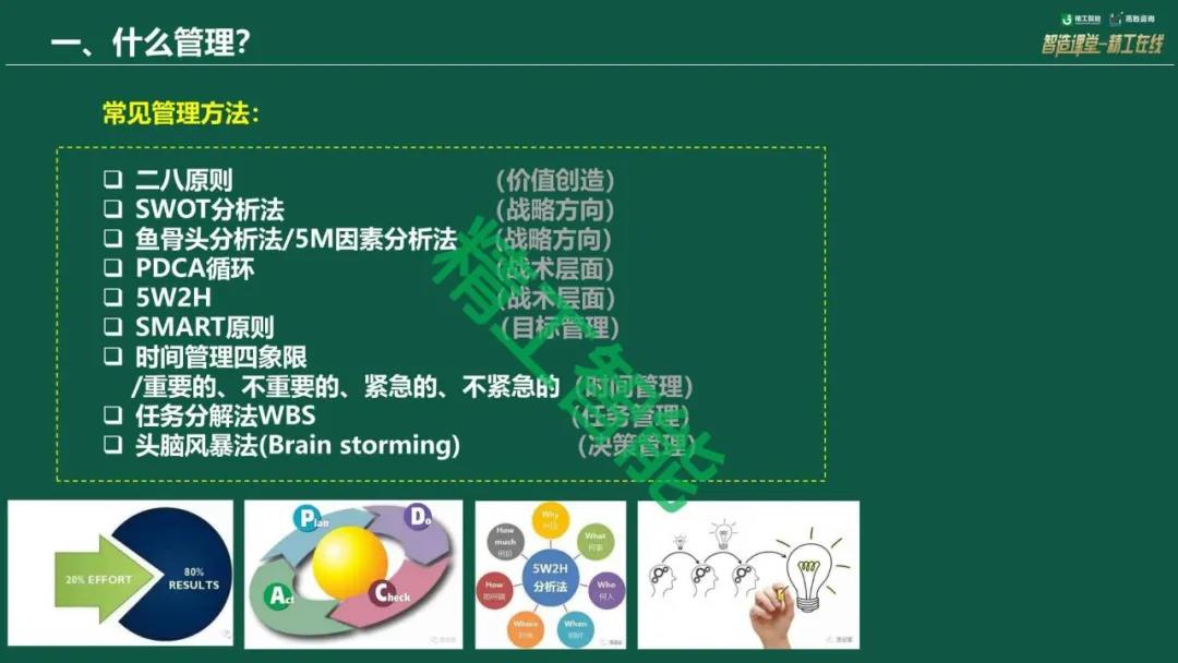 宋老師表示管理的本質(zhì)管人、理事(領導管人、流程管事)!在簡要介紹了管理的對象和管理方法論之后,列舉了一些常見管理方法,并重點講解了精益生產(chǎn)與五星班組這兩個最重要的管理方法,因為它們是數(shù)字化轉(zhuǎn)型的基礎。