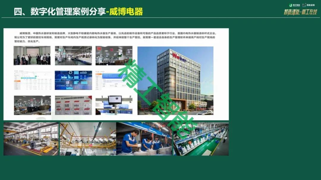 首先,宋老師以威博家電2019年引入精工智能數(shù)字化工廠解決方案為例,向大家展示了威博通過接入MES系統(tǒng)、打通ERP等多系統(tǒng),銷售、生產(chǎn)、庫存等多個管理系統(tǒng)得到全面優(yōu)化,車間生產(chǎn)效率提升15%以上,成為提質(zhì)增效的標桿企業(yè)之一。